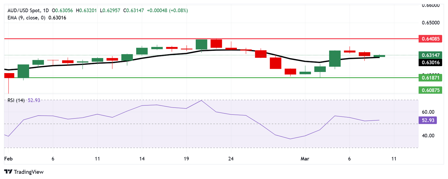 AUD/USD is trading near 0.6320 on Monday, with technical analysis of the daily chart indicating the pair remains slightly above the nine-day Exponential Moving Average (EMA), suggesting strengthening short-term momentum. Additionally, the 14-day Relative Strength Index (RSI) stays above 50, reinforcing a bullish outlook.