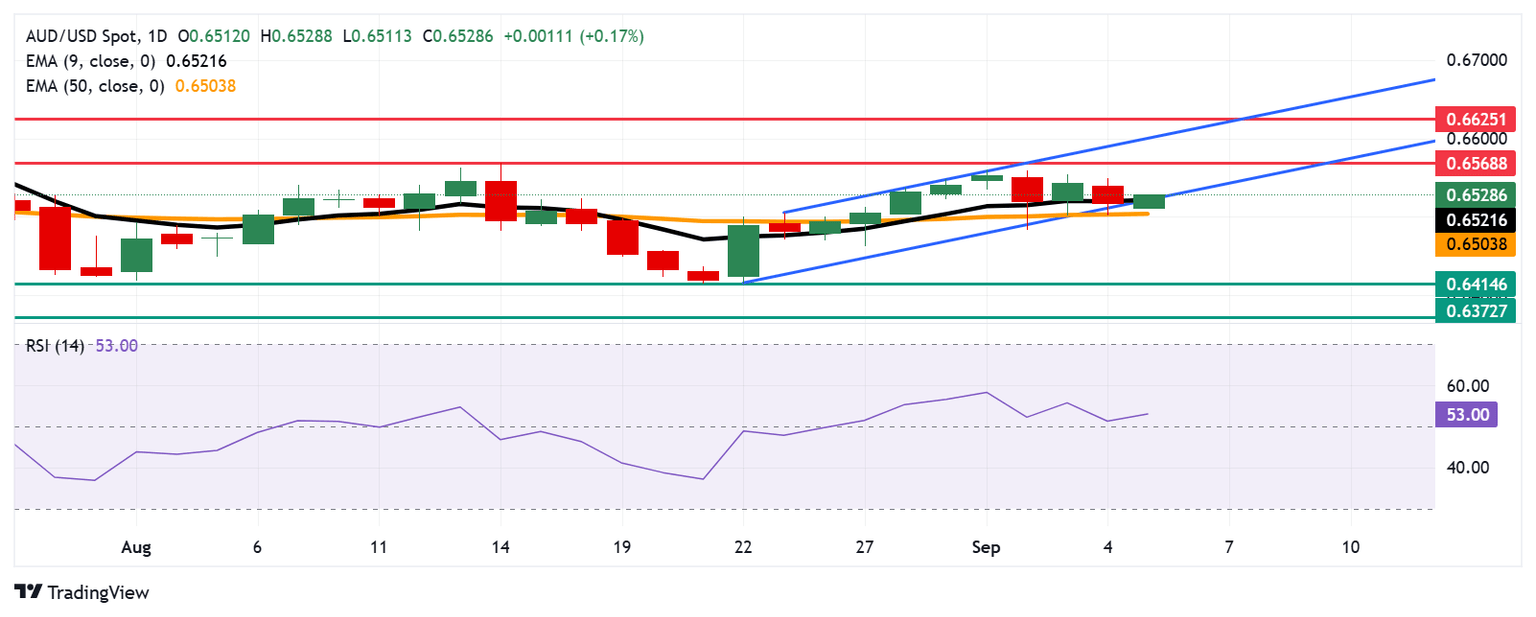 AUD/USD is trading around 0.6530 on Friday. The technical analysis of the daily chart shows the pair is positioned on the lower boundary of the ascending channel pattern. Further movement will offer a clear directional trend. The pair is positioned slightly above the nine-day Exponential Moving Average (EMA), indicating short-term price momentum is still stronger.