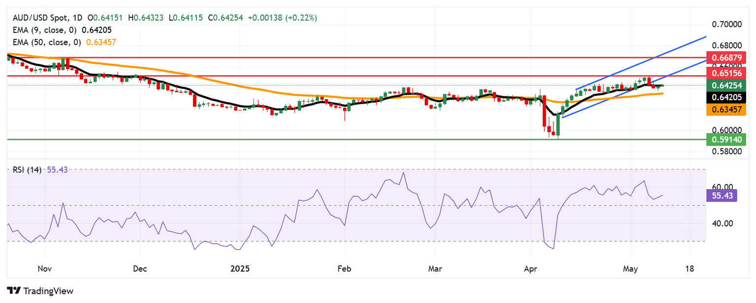 The AUD/USD pair is testing its initial support at the nine-day EMA at 0.6420, followed by the 50-day EMA at 0.6345. A breach below these levels could weaken the bullish outlook and may expose the pair to 0.5914, the lowest since March 2020.