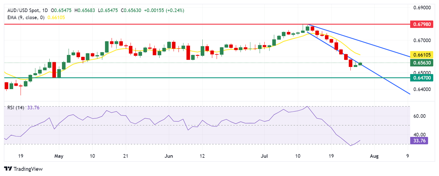The Australian Dollar trades around 0.6560 on Monday. The daily chart analysis shows that the AUD/USD pair has returned to the descending channel, indicating a potential weakening of the bearish bias. The 14-day Relative Strength Index (RSI) is slightly above 30 level, suggesting the currency pair may be due for a potential correction soon.