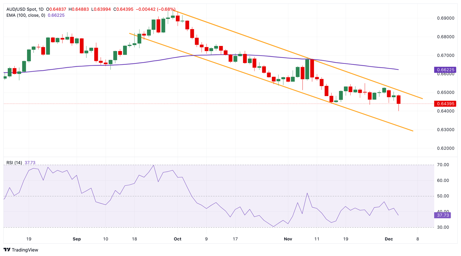 The Australian Dollar trades on a softer note on the day. The negative outlook of the AUD/USD pair remains in play, characterized by the price holding below the key 100-day Exponential Moving Average (EMA) on the daily timeframe. The 14-day Relative Strength Index (RSI) stands below the 50-midline near 37.70, supporting the downward movement of the pair in the near term.