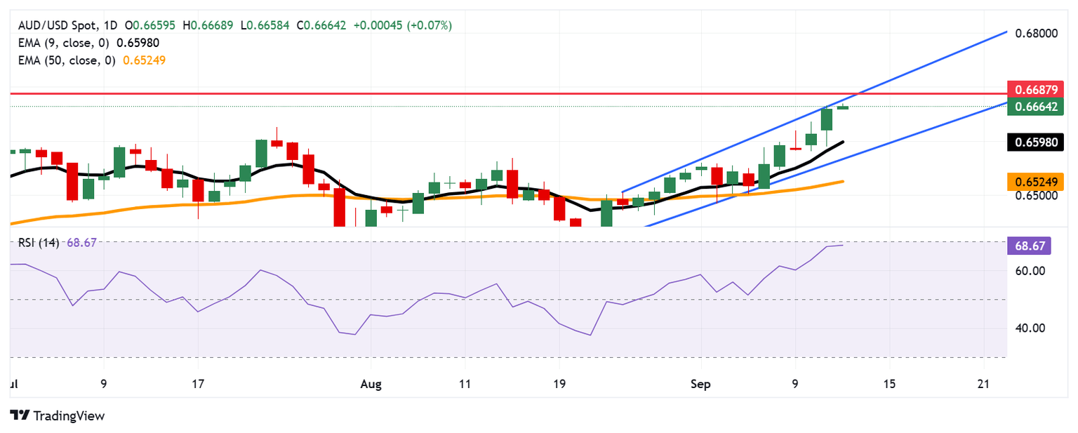 AUD/USD is trading around 0.6660 on Friday. The technical analysis of the daily chart shows the pair moves upwards within the ascending channel pattern, strengthening the bullish bias. Additionally, the pair is positioned above the nine-day Exponential Moving Average (EMA), indicating short-term price momentum is stronger.