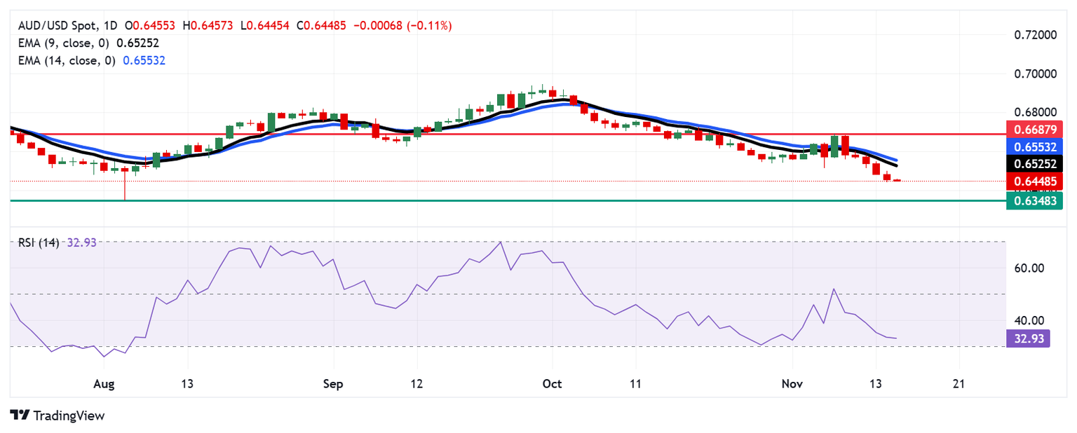 AUD/USD trades near 0.6470 on Friday. An analysis of the daily chart shows short-term downward pressure, as the pair remains below the nine-day Exponential Moving Average (EMA). Additionally, the 14-day Relative Strength Index (RSI) is slightly above 30, indicating potential oversold conditions. If the RSI dips below 30, it could signal an oversold situation, suggesting a possible upward correction.