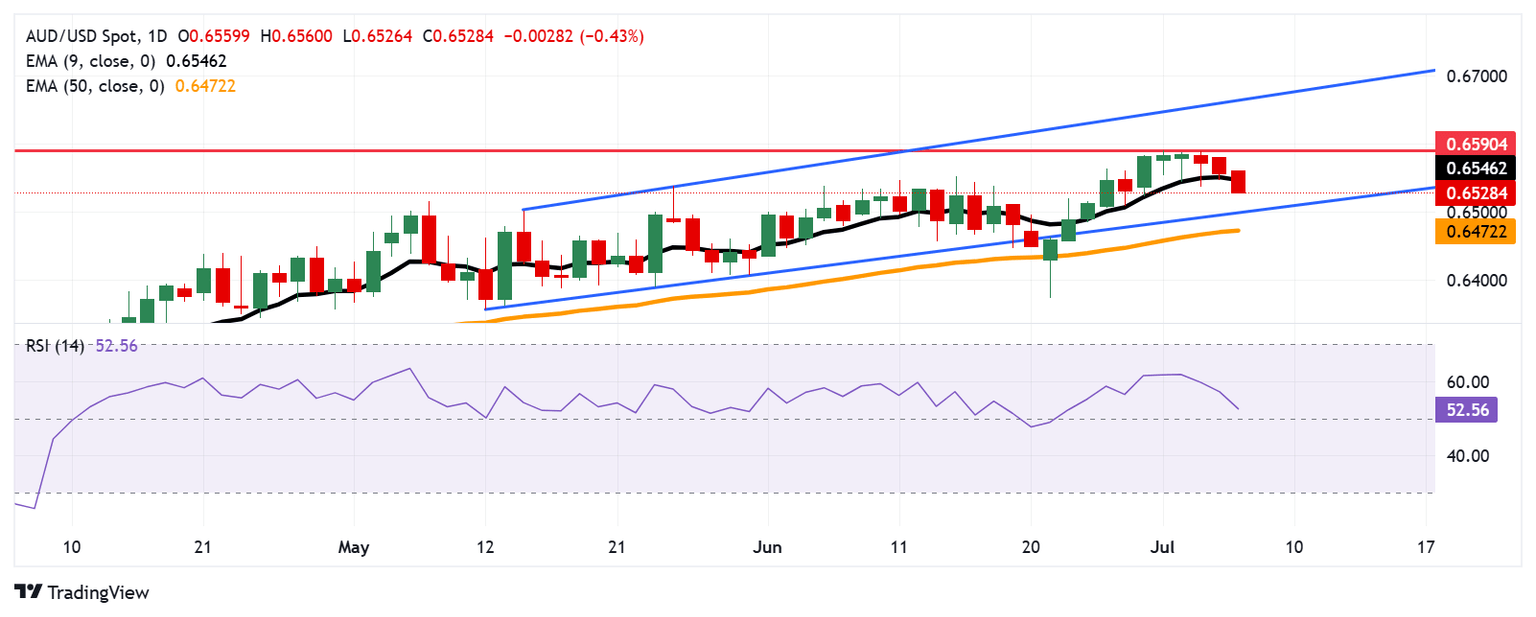 The AUD/USD pair may test the primary barrier at the nine-day EMA of 0.6546. A break above this level could improve the price momentum and support the pair to approach the eight-month high of 0.6590, recorded on July 1. Further advances would support the pair to explore the region around the upper boundary of the ascending channel around 0.6670.