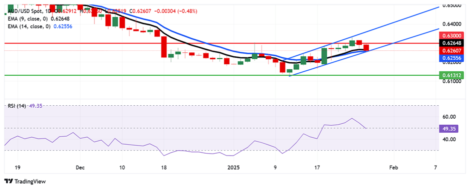 The AUD/USD pair tests immediate support at the 14-day Exponential Moving Average (EMA) of 0.6256. Additional support lies near the channel's lower boundary around 0.6250.