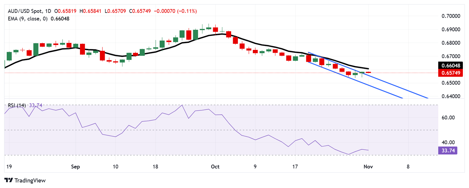 AUD/USD trades near 0.6570 on Friday. The daily chart indicates a potential softening of the bearish bias, as the pair has broken above its descending channel pattern. The 14-day Relative Strength Index (RSI) aligns with lower highs and lows, suggesting that bearish sentiment persists.