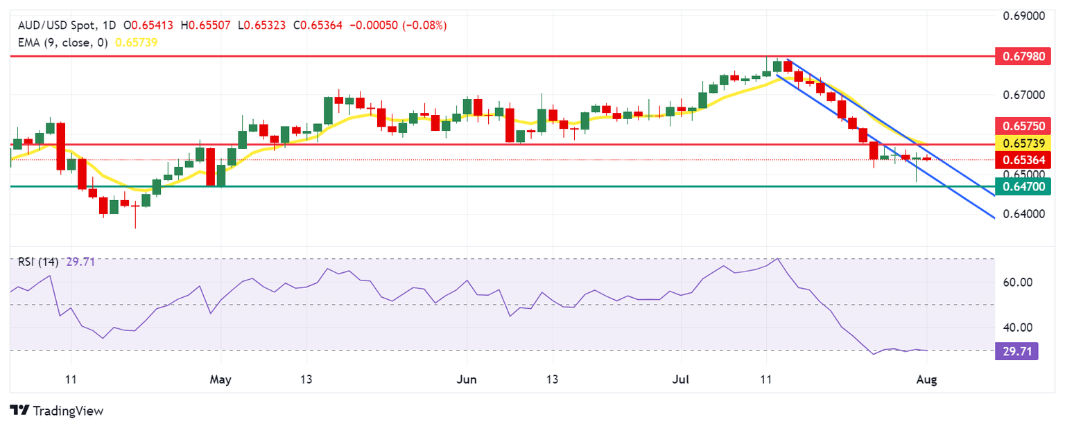 The Australian Dollar trades around 0.6540 on Thursday. The daily chart analysis shows that the AUD/USD pair consolidates within a descending channel, indicating a bearish bias. The 14-day Relative Strength Index (RSI) is near the oversold 30 level, suggesting a potential upward correction might be imminent.