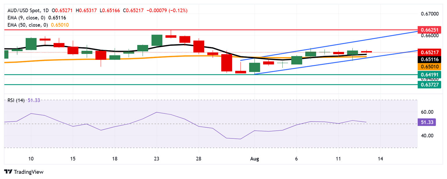 AUD/USD is trading around 0.6520 on Wednesday. Technical analysis on the daily chart suggests a prevailing bullish bias as the pair remains within the ascending channel pattern. Additionally, the pair is still remaining above the nine-day Exponential Moving Average (EMA), signaling that short-term momentum is strengthening. The 14-day Relative Strength Index (RSI) is positioned at the 50 level, suggesting a neutral market bias. Further movement will indicate a clear directional trend.