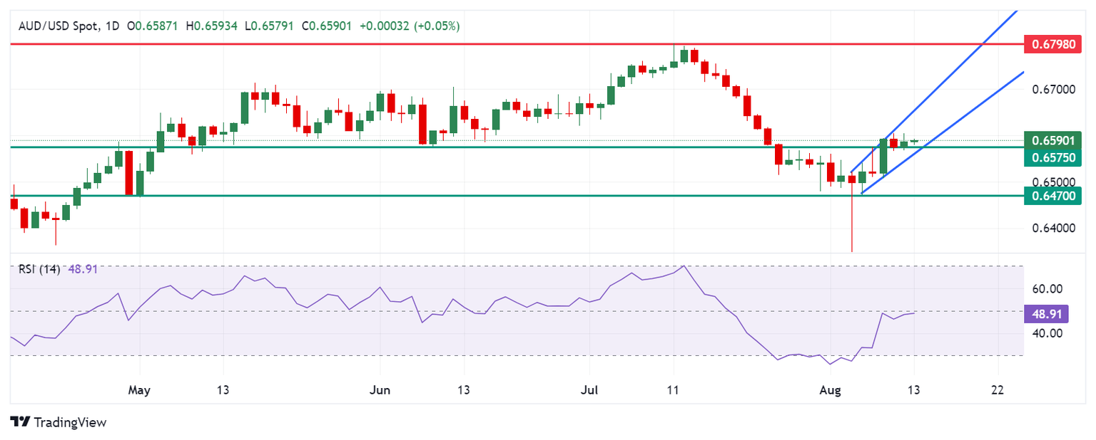 The Australian Dollar trades around 0.6590 on Tuesday. The daily chart analysis shows that the AUD/USD pair steadies within an ascending channel, suggesting a bullish bias. However, the 14-day Relative Strength Index (RSI) consolidates below the 50 mark. A rise above this threshold could signal an increase in bullish momentum.