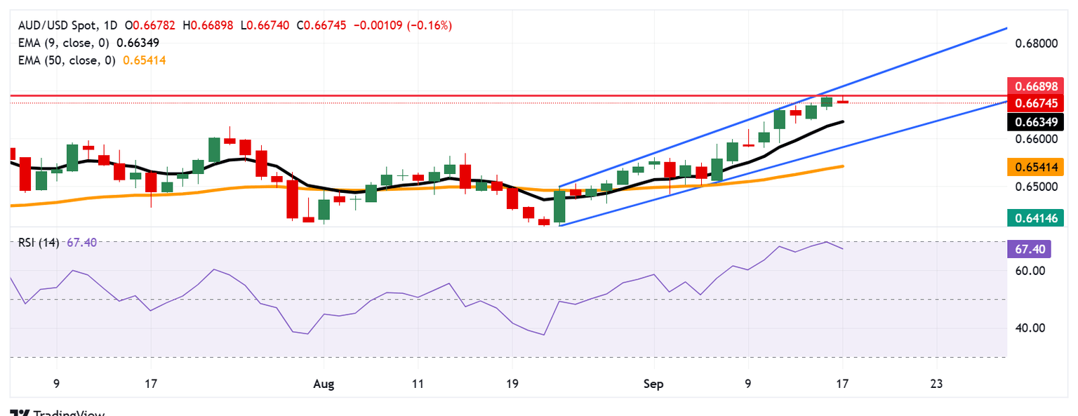AUD/USD is trading around 0.6670 on Wednesday. The technical analysis of the daily chart shows the pair moves upwards within an ascending channel pattern, strengthening the bullish bias. Additionally, the short-term price momentum is stronger as the pair remains above the nine-day Exponential Moving Average (EMA).