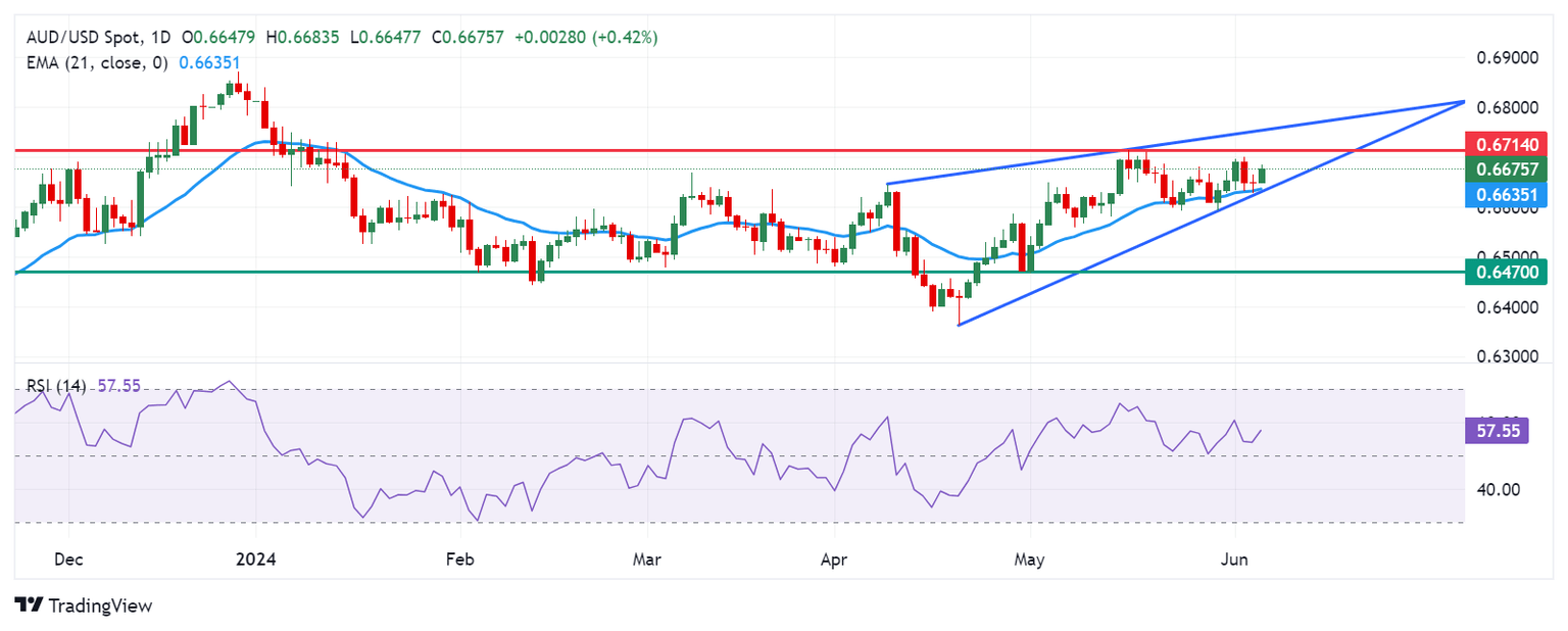 The Australian Dollar trades around 0.6670 on Thursday. Analysis of the daily chart shows a bullish bias for the AUD/USD pair, as it remains within a rising wedge pattern. This bullish bias is further supported by the 14-day Relative Strength Index (RSI), which is above the 50 level.