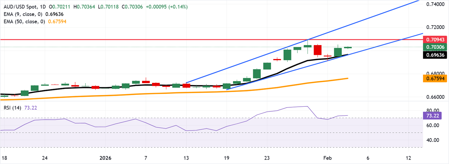 The AUD/USD pair is trading around 0.7030 on Wednesday. Daily chart analysis indicates that the pair remains within the ascending channel pattern, indicating a persistent bullish bias. The 14-day Relative Strength Index (RSI) is at 73.30; it typically signals bullish momentum, but stretching momentum.
