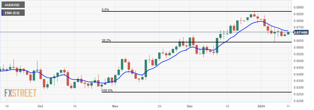 The Australian Dollar trades near 0.6720 on Thursday situated below the nine-day Exponential Moving Average (EMA) at 0.6724. A potential breakthrough above the latter could bring the AUD/USD pair closer to the key barrier at 0.6750. Conversely, on the downside, the 0.6700 level holds importance as a significant psychological support following the major support of 0.6650. A break below the latter could push the AUD/USD pair to navigate the area around the 38.2% Fibonacci retracement level at 0.6637. If the price drops below this level, it may lead the AUD/USD pair to explore the territory around the psychological level of 0.6600.