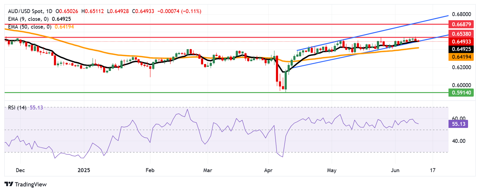 The AUD/USD pair is trading around 0.6500 on Tuesday. The daily chart’s technical analysis suggests a potential weakening of the bullish bias as the pair attempts to break below the lower boundary of the ascending channel. Additionally, the pair is slightly positioned above the nine-day Exponential Moving Average (EMA); breaking below would weaken the short-term price momentum. However, the 14-day Relative Strength Index (RSI) is remaining above the 50 mark, indicating a bullish bias.