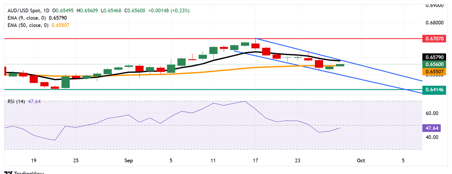 AUD/USD is trading around 0.6560 on Monday. Technical analysis on the daily chart shows that the pair remains within a descending channel pattern, indicating the market sentiment is bearish. Additionally, the 14-day Relative Strength Index (RSI) is positioned slightly below the 50 level, strengthening the bearish bias.