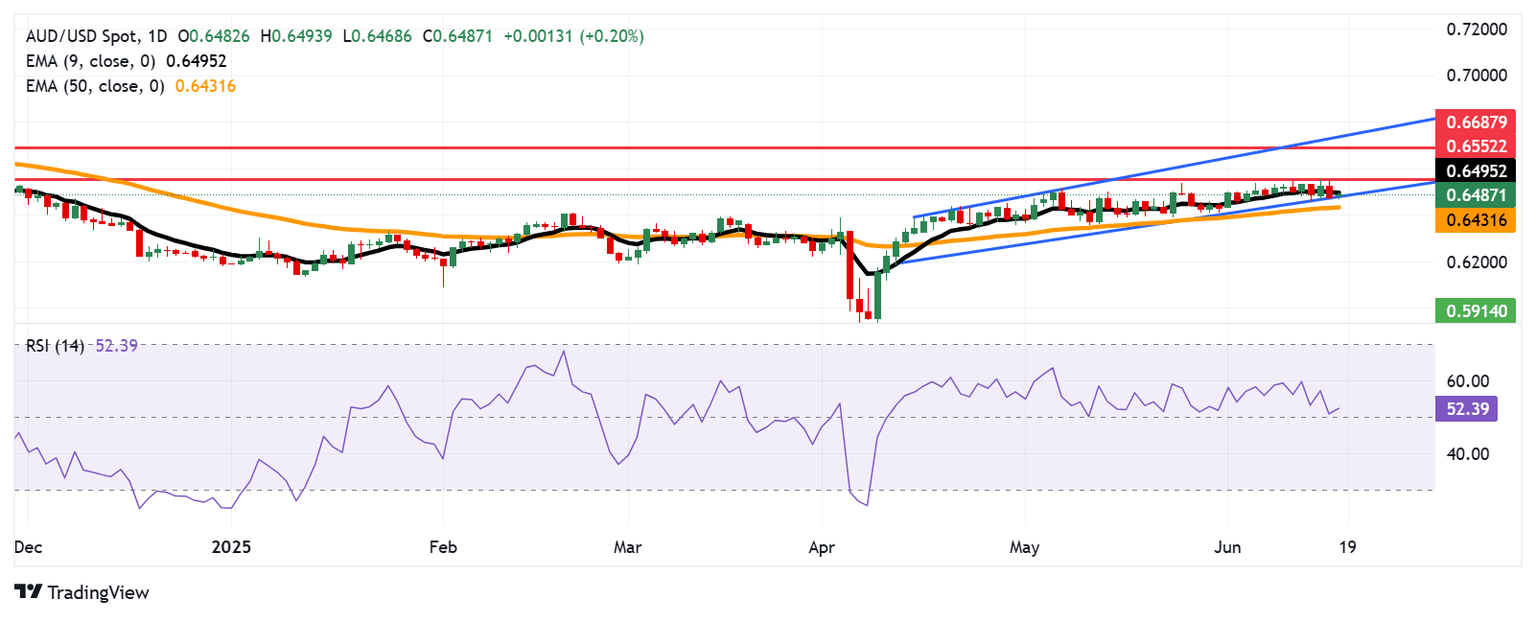 AUD/USD is trading around 0.6480 on Wednesday, with a prevailing bullish bias as the daily chart’s technical analysis indicates that the pair remains within the ascending channel. Moreover, the 14-day Relative Strength Index (RSI) is positioned slightly above the 50 mark, suggesting a prevailing bullish outlook. However, the pair has moved below the nine-day Exponential Moving Average (EMA), indicating that short-term price momentum is weakening.