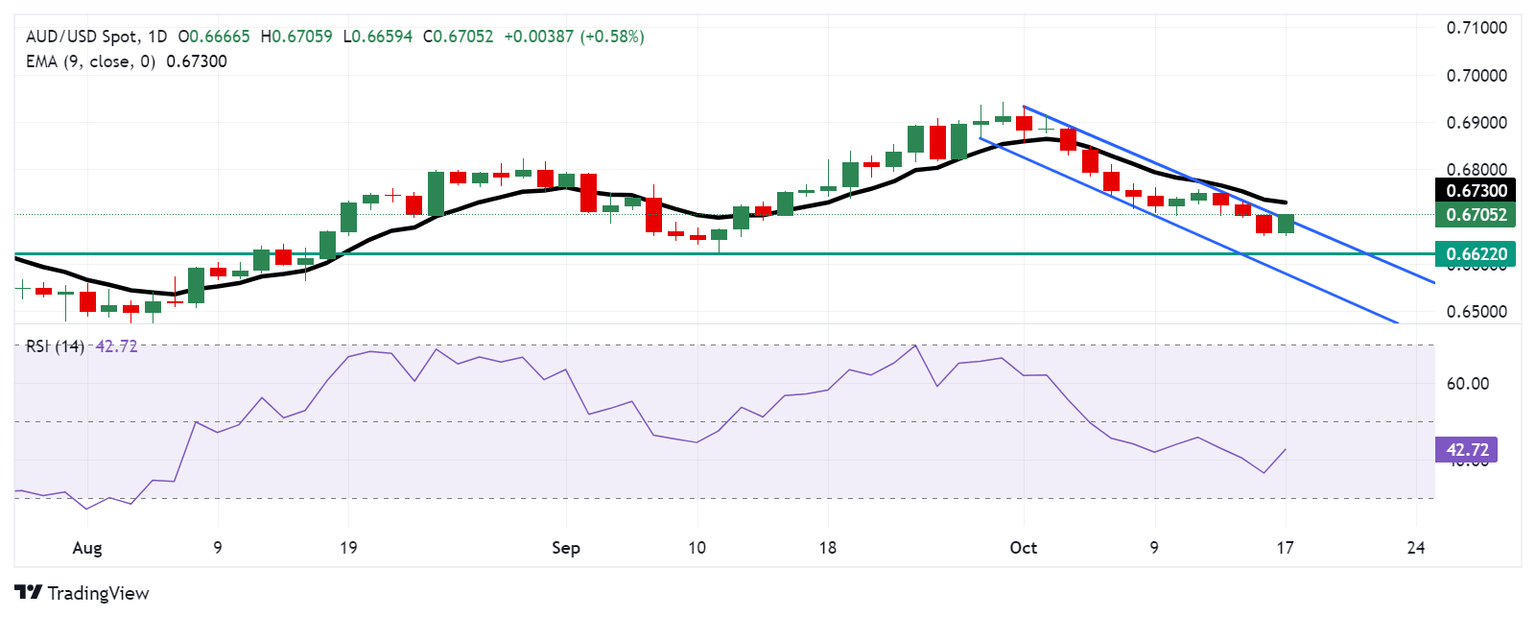 The AUD/USD pair hovers around 0.6700 on Thursday. An analysis of the daily chart shows the pair testing the upper boundary of a descending channel. If it successfully breaks above this channel, it could signal a shift in momentum from bearish to bullish. However, bearish sentiment remains dominant with the 14-day Relative Strength Index (RSI) still below 50.