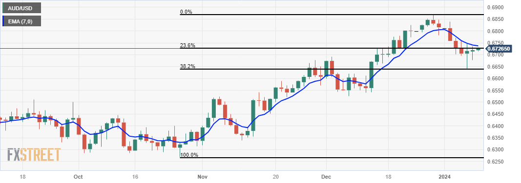 The Australian Dollar trades near 0.6710 on Tuesday. The AUD/USD pair could face a key resistance at the seven-day Exponential Moving Average (EMA) of 0.6737 before the major level at the 0.6750 level. A successful breakthrough above the latter could pave the way for the AUD/USD pair to challenge the psychological barrier at 0.6800. On the downside, the 23.6% Fibonacci retracement at 0.6725 acted as an immediate support followed by the psychological support at 0.6700. A break below the psychological support could push the AUD/USD pair to retest the major support at 0.6650 and the 38.2% Fibonacci retracement level at 0.6637.