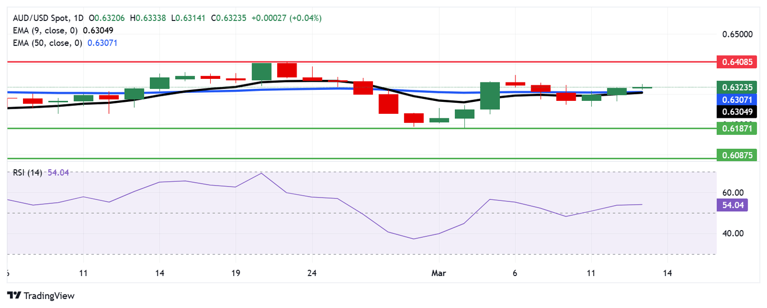 The AUD/USD pair is trading near 0.6320 on Thursday, with technical analysis of the daily chart showing the pair moving above the nine-day Exponential Moving Average (EMA), signaling strengthening short-term price momentum. Additionally, the 14-day Relative Strength Index (RSI) has moved slightly above 50, indicating a bullish bias.