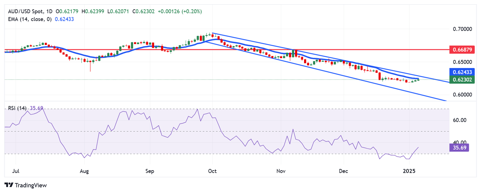 The AUD/USD pair trades near 0.6230 on Monday, maintaining a bearish outlook as it continues to move within a descending channel on the daily chart. However, the 14-day Relative Strength Index (RSI) climbs above the 30 level, indicating a potential weakening of bearish momentum, despite the ongoing downtrend.