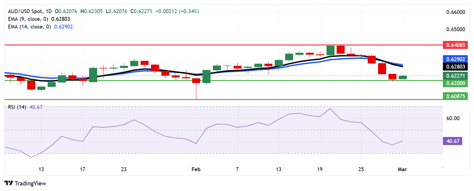 The AUD/USD pair is trading around 0.6220 on Monday. The daily chart analysis suggests that the pair remains under pressure, trading below the nine- and 14-day Exponential Moving Averages (EMAs), indicating weakening short-term momentum. Additionally, the 14-day Relative Strength Index (RSI) remains below 50, reinforcing the bearish outlook.