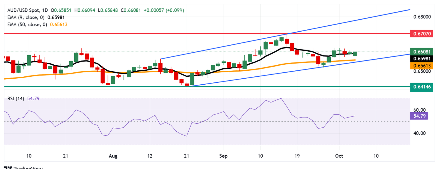 The immediate support lies at the psychological level of 0.6600, aligned with the nine-day Exponential Moving Average (EMA) of 0.6598. Further declines would lead to support at the 50-day EMA of 0.6561, followed by the ascending channel’s lower boundary around 0.6550. A break below the channel would likely cause the emergence of a bearish bias and put downward pressure on the AUD/USD pair, potentially navigating the region around the fourth-month low of 0.6414, recorded on August 21.