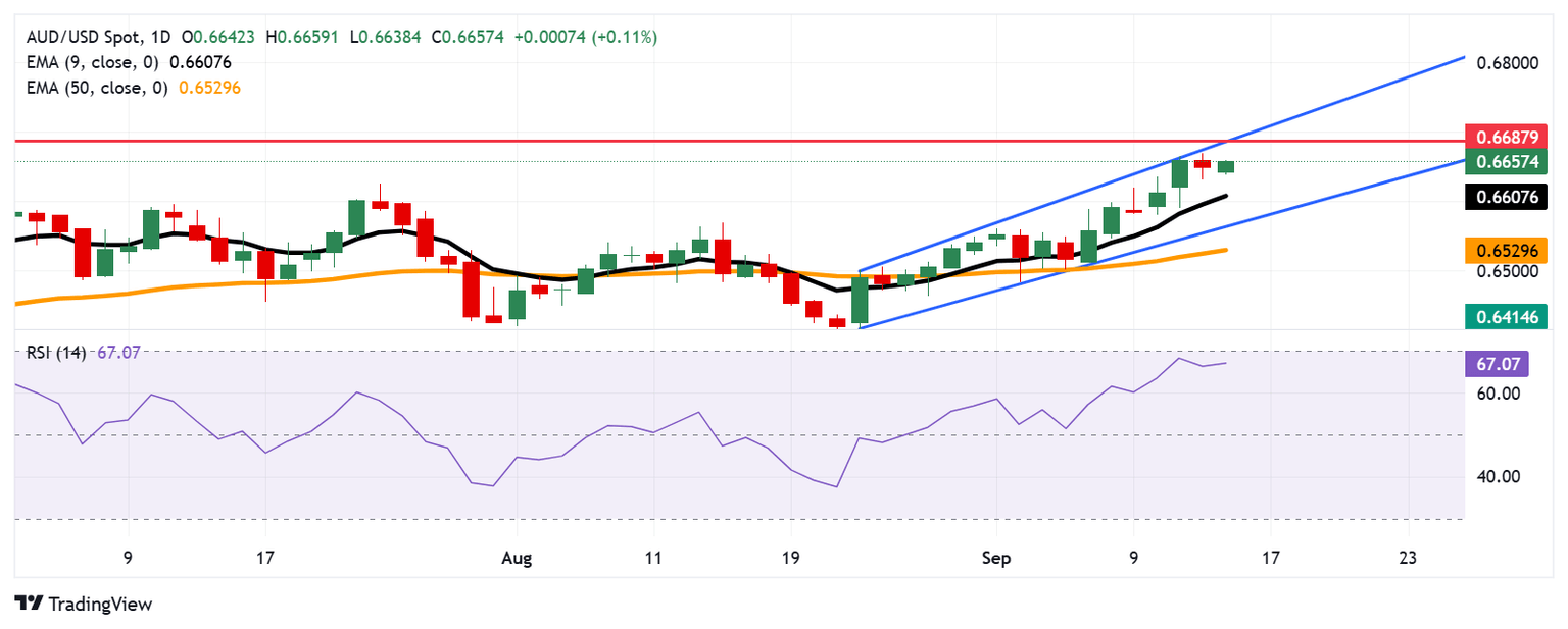 AUD/USD is trading around 0.6660 on Monday. The technical analysis of the daily chart shows the pair moves upwards within an ascending channel pattern, indicating the market bias is bullish. Additionally, the pair is positioned above the nine-day Exponential Moving Average (EMA), indicating short-term price momentum is stronger.