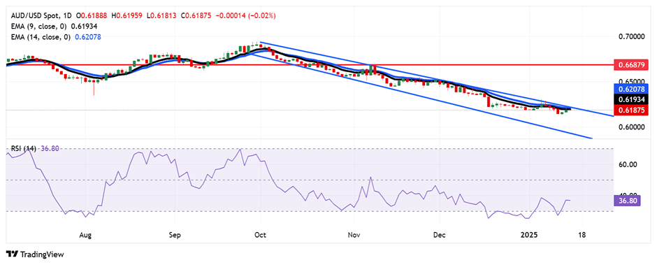 The AUD/USD pair faces immediate resistance at the nine-day Exponential Moving Average (EMA) at 0.6193, followed by the 14-day EMA at 0.6207. A more significant resistance level lies near the upper boundary of the descending channel, around 0.6220.