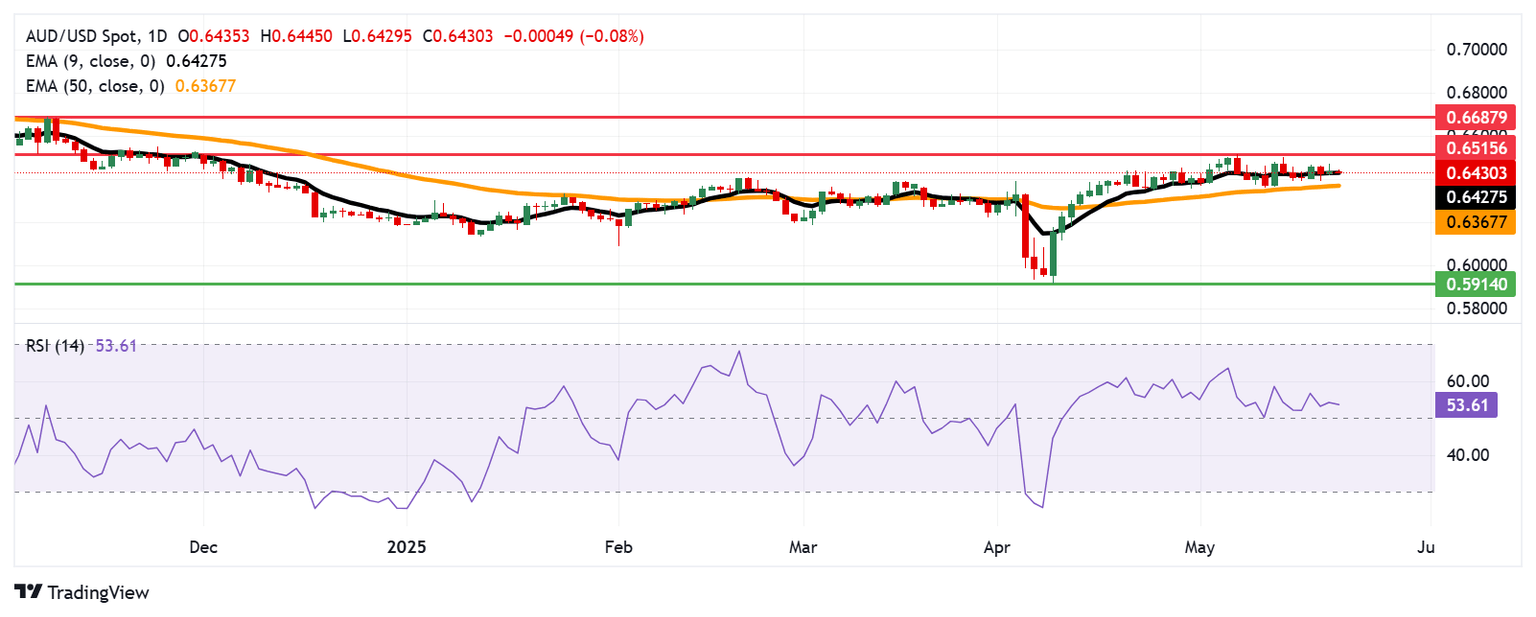 The AUD/USD pair is trading around 0.6440 on Thursday. The daily technical indicators reflect a bullish tone as the pair maintains its position above the nine-day Exponential Moving Average (EMA), while the 14-day Relative Strength Index (RSI) stays above the neutral 50 level, both supporting persistent upward momentum.