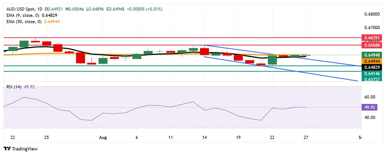 The AUD/USD pair is trading around 0.6500 on Wednesday. The technical analysis of the daily chart indicates that the pair is positioned slightly above the descending channel pattern, suggesting an emergence of a bullish bias. Additionally, the pair is trading above the nine-day EMA, indicating short-term price momentum is strengthening.