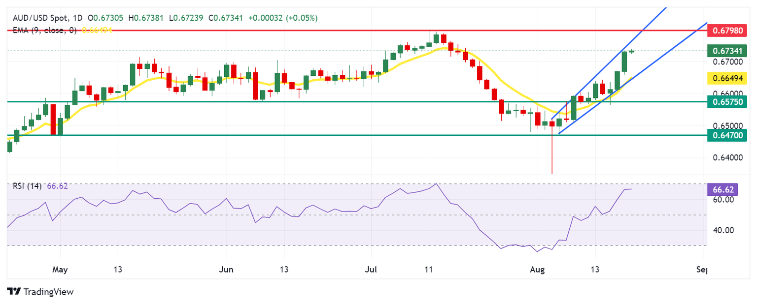 The Australian Dollar trades around 0.6730 on Tuesday. According to daily chart analysis, the AUD/USD pair is trending upwards within an ascending channel, indicating a bullish bias. Furthermore, the 14-day Relative Strength Index (RSI) is appreciating toward the 70 mark, reinforcing the ongoing bullish momentum.