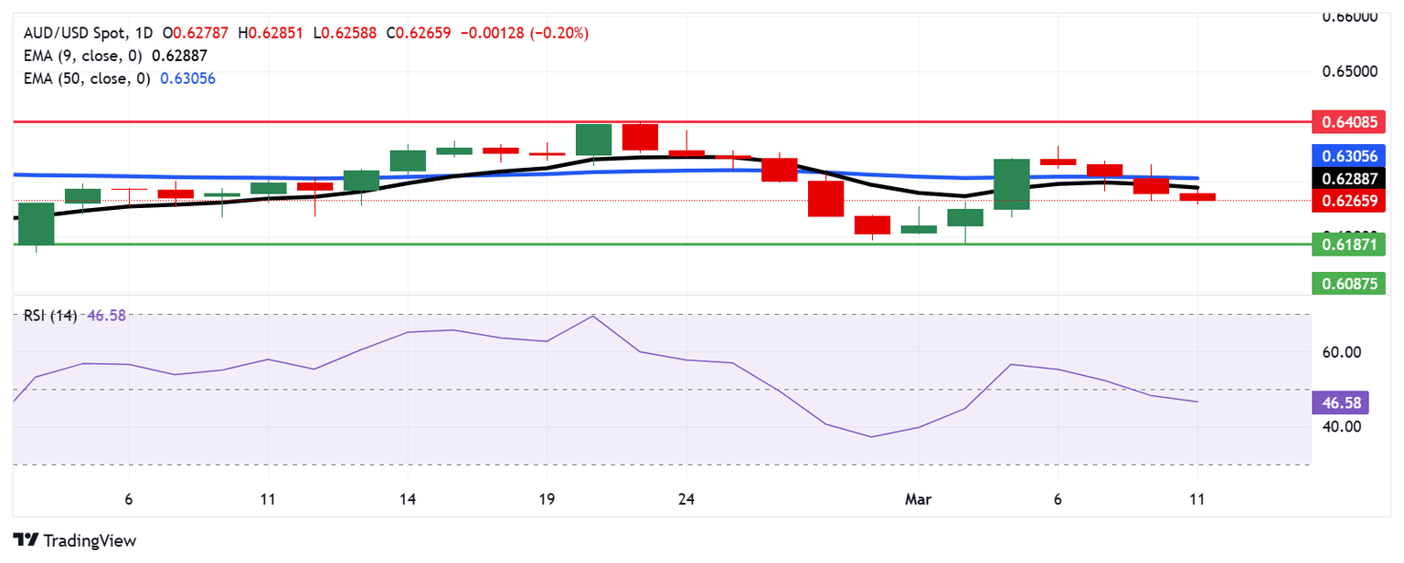 The AUD/USD pair is trading near 0.6260 on Tuesday, with technical analysis of the daily chart showing the pair slipping below the nine-day Exponential Moving Average (EMA), signaling weakening short-term momentum. Additionally, the 14-day Relative Strength Index (RSI) has fallen below 50, indicating a shift toward a bearish bias.