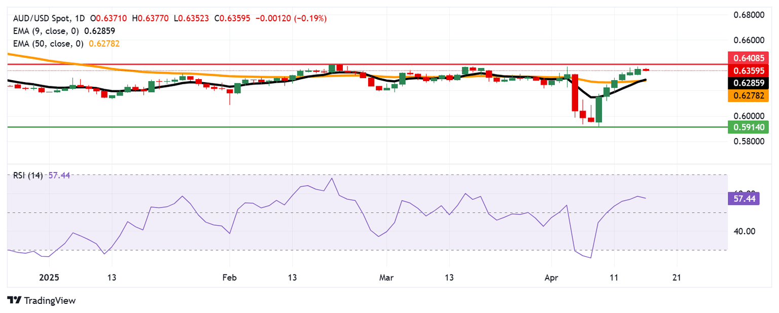 The AUD/USD pair is trading near the 0.6360 level on Thursday, with technical indicators on the daily chart suggesting a bullish bias. The pair remains above the nine-day Exponential Moving Average (EMA), while the 14-day Relative Strength Index (RSI) holds above the neutral 50 level, reinforcing the positive momentum.