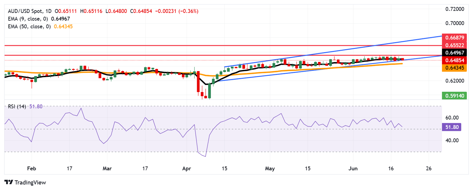AUD/USD is trading around 0.6490 on Thursday, with a prevailing bullish bias as the daily chart’s technical analysis indicates that the pair remains within the ascending channel. The 14-day Relative Strength Index (RSI) is positioned slightly above the 50 mark, suggesting a persistent bullish bias. However, the pair remains below the nine-day Exponential Moving Average (EMA), indicating that short-term price momentum is weakening.