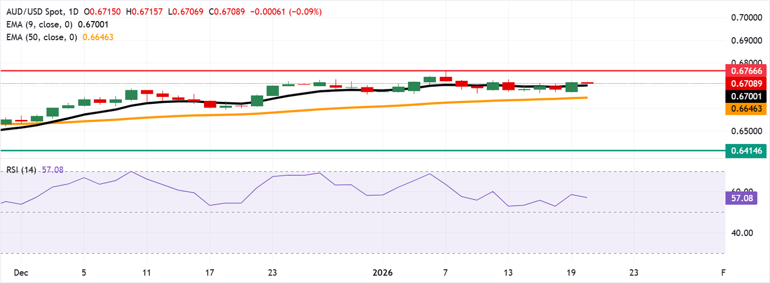 The AUD/USD pair is trading around 0.6710 on Tuesday. Daily chart analysis indicates that the pair is consolidating near the nine-day Exponential Moving Average (EMA), pointing to a neutral short-term bias. Meanwhile, the 14-day Relative Strength Index (RSI), at 56.70, remains above the midpoint, reinforcing underlying upside momentum.