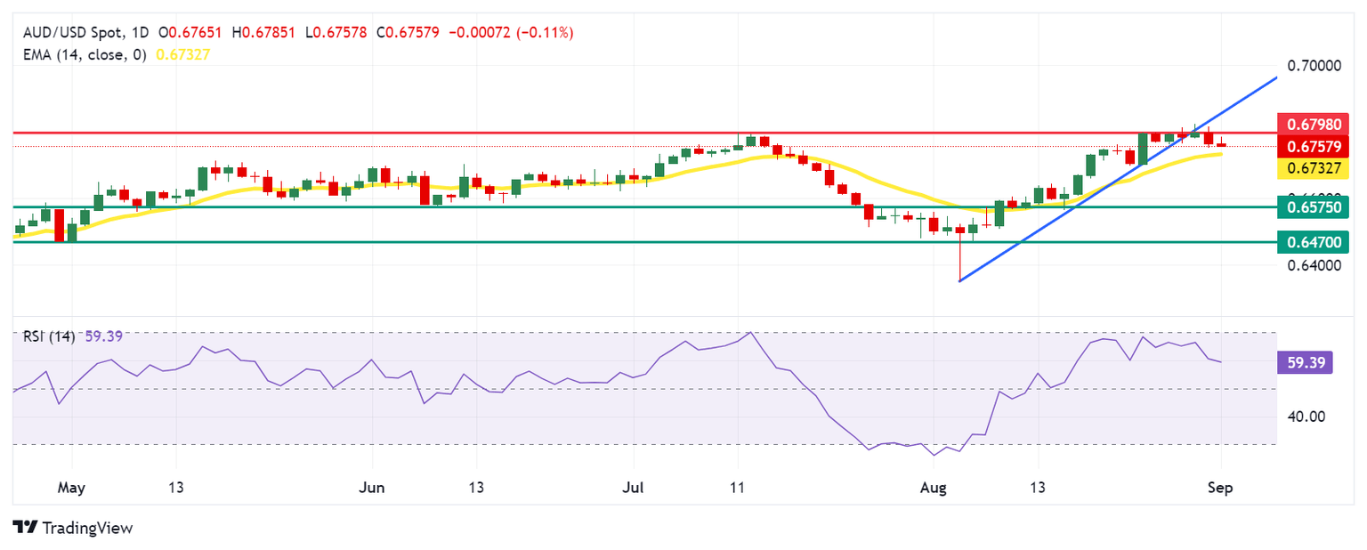 The Australian Dollar trades around 0.6760 on Monday. Analyzing the daily chart, the AUD/USD pair is positioned below an uptrend line, suggesting a potential weakening of the bullish bias. However, the 14-day Relative Strength Index (RSI) remains above the 50 level, which continues to support the overall bullish trend.