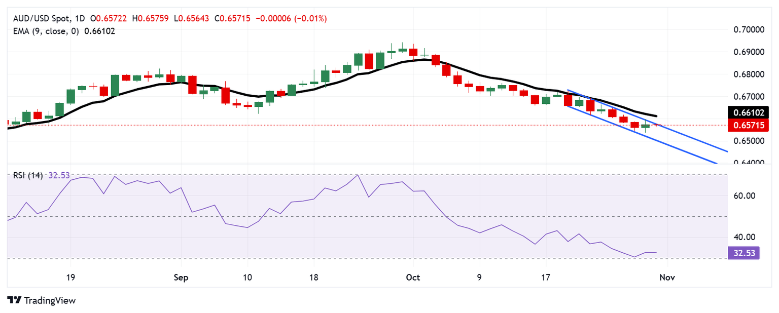 AUD/USD hovers near 0.6570 on Thursday. The daily chart shows a short-term bearish trend as the pair trades within a descending channel. The 14-day Relative Strength Index (RSI) is trending lower and sits just above the 30 level, reinforcing the bearish sentiment.