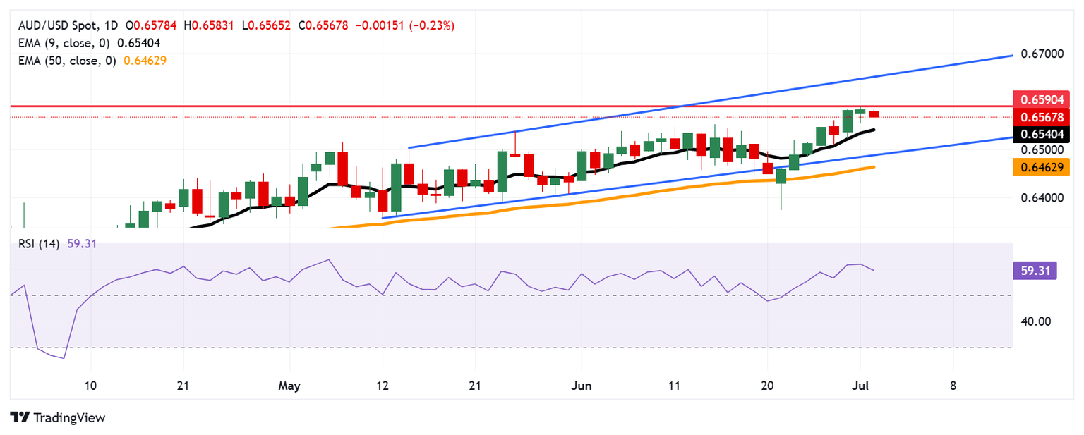 The AUD/USD pair is trading around 0.6570 on Wednesday. The daily technical analysis suggested a prevailing bullish bias as the pair remains within the ascending channel pattern. The 14-day Relative Strength Index (RSI) remains above the 50 mark, strengthening the bullish sentiment. Additionally, the pair rises above the nine-day Exponential Moving Average (EMA), indicating that short-term price momentum is stronger.