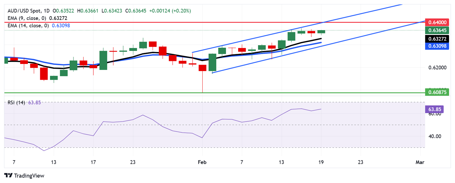 The AUD/USD pair hovers around 0.6360 on Wednesday, trading within an ascending channel pattern that signals a bullish market bias. The 14-day Relative Strength Index (RSI) remains above 50, reinforcing the positive outlook.