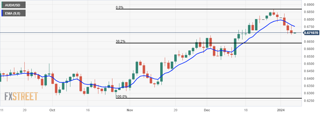 The Australian Dollar trades near 0.6710 on Friday, with a significant resistance level at 0.6750 aligned with the nine-day Exponential Moving Average (EMA) at 0.6751. A successful breakthrough above the latter could pave the way for the AUD/USD pair to challenge the psychological barrier at 0.6800. On the downside, the psychological level at 0.6700 could act as a potential support. A break below the psychological level could push the AUD/USD pair to navigate the major support at 0.6650 followed by the 38.2% Fibonacci retracement level at 0.6637.