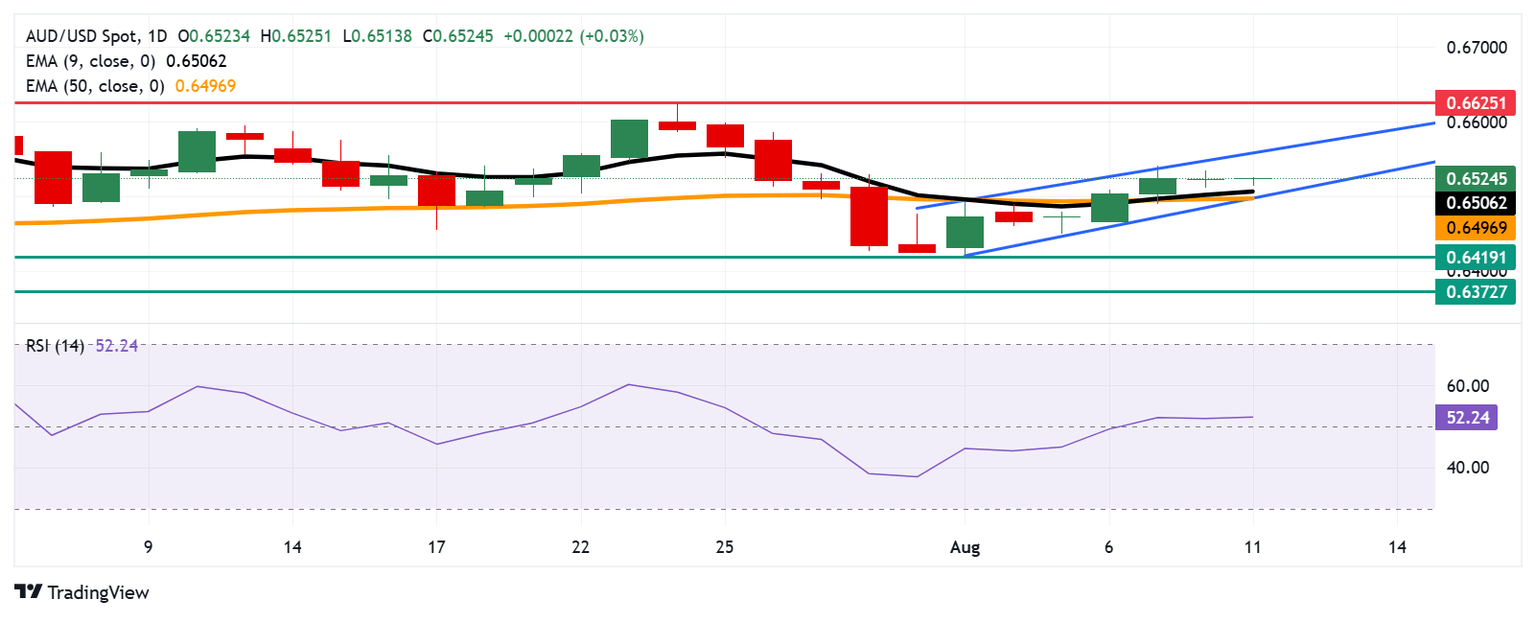 The AUD/USD pair is trading around 0.6520 on Monday. Technical analysis on the daily chart suggests a bullish market sentiment as the pair moves upwards within an ascending channel pattern. Additionally, the 14-day Relative Strength Index (RSI) is positioned above the 50 level, strengthening the bullish bias. The pair also remains above the nine-day Exponential Moving Average (EMA), signaling that short-term momentum is stronger.