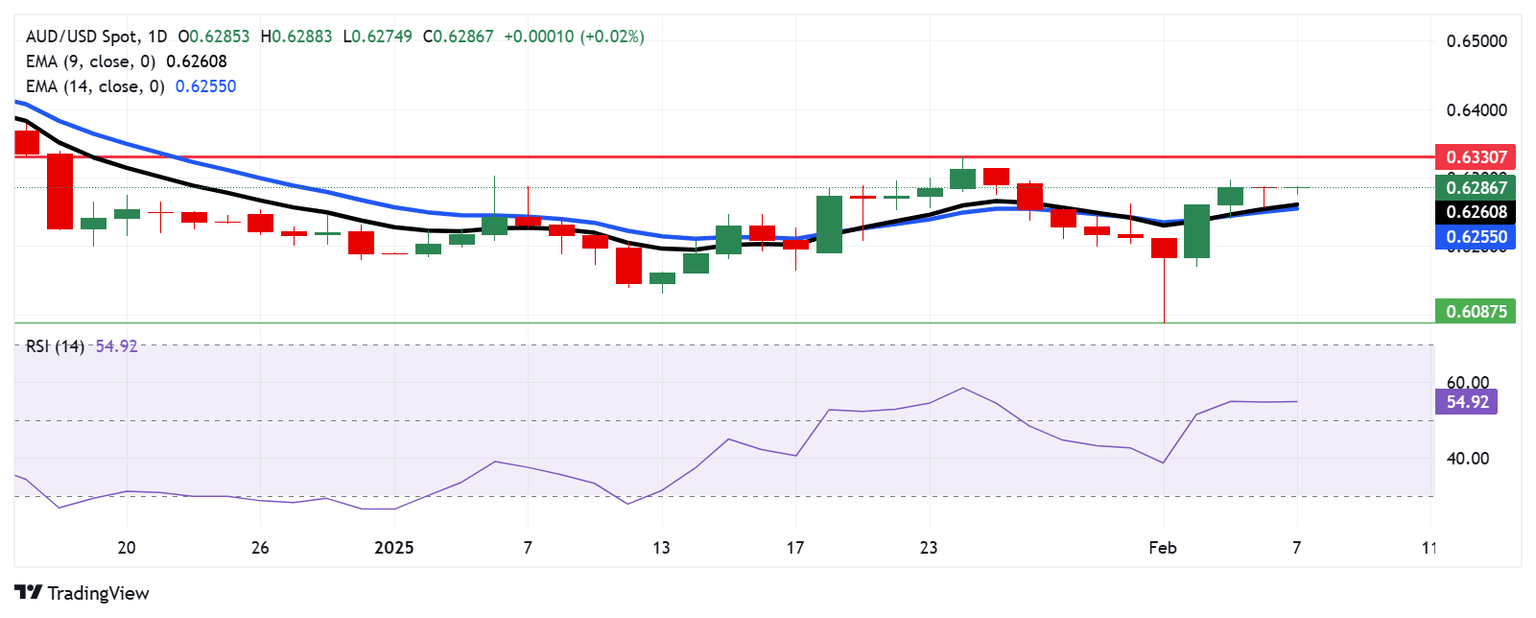 AUD/USD hovers near 0.6290 on Friday, maintaining its position above the nine- and 14-day Exponential Moving Averages (EMAs) on the daily chart, signaling stronger short-term bullish momentum. Additionally, the 14-day Relative Strength Index (RSI) remains above the 50 level, reinforcing the bullish trend.