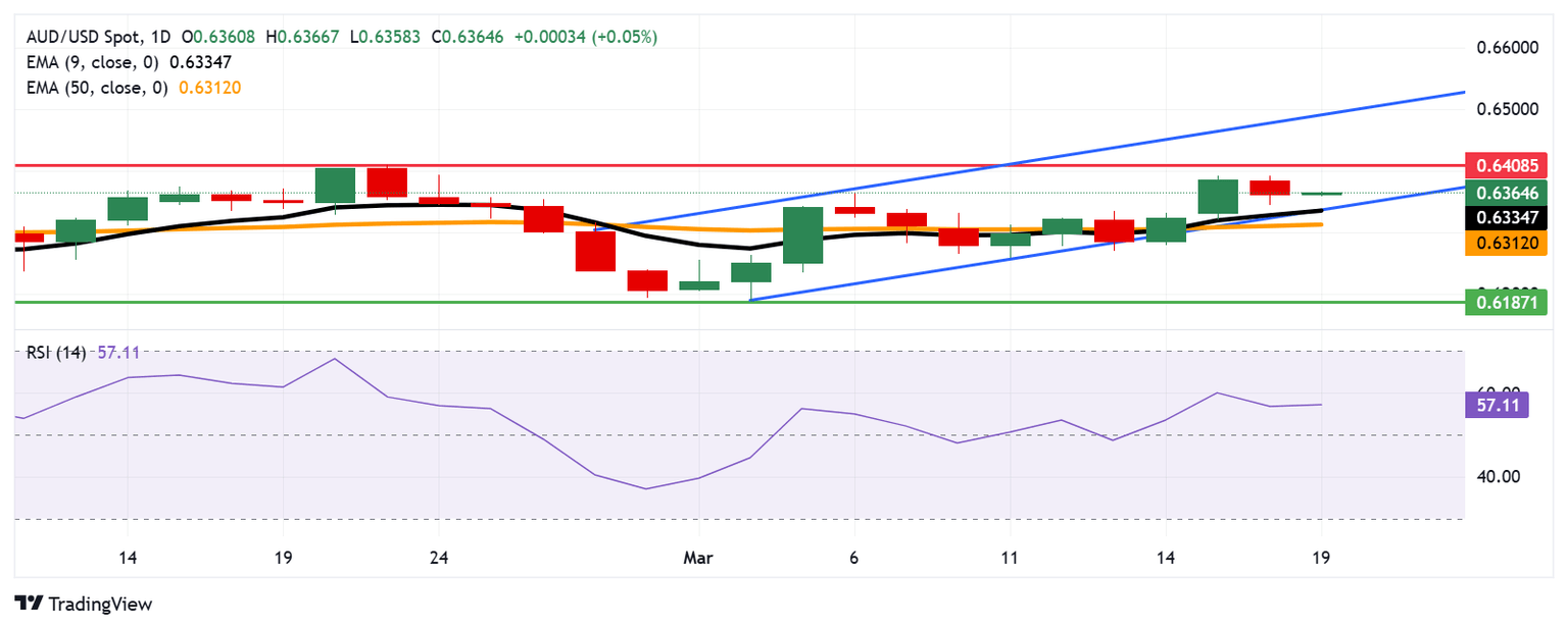Key support lies at the nine-day Exponential Moving Average (EMA) of 0.6334, aligned with the lower boundary of the ascending channel. Further support is seen at the 50-day EMA at 0.6312. A decisive break below this critical zone could weaken the bullish outlook, exposing the AUD/USD pair to further downside pressure toward the six-week low of 0.6187, recorded on March 5.