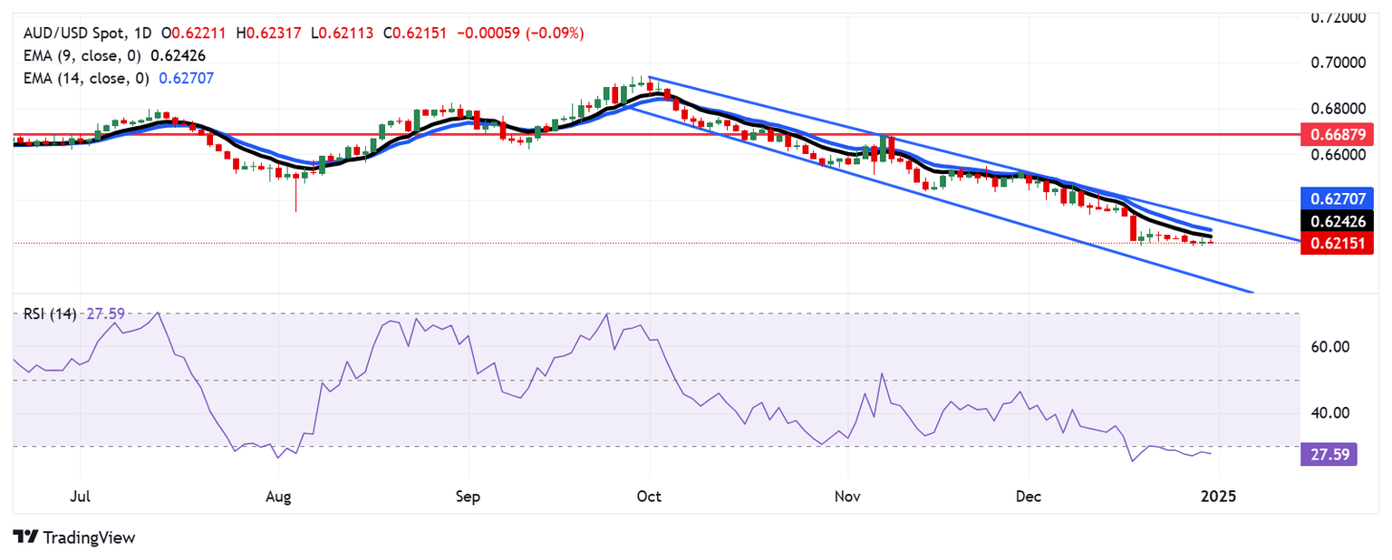 The AUD/USD pair faces immediate resistance at the nine-day Exponential Moving Average (EMA) of 0.6243, followed by the 14-day EMA at 0.6271. A more significant hurdle is the descending channel’s upper boundary, around 0.6330.