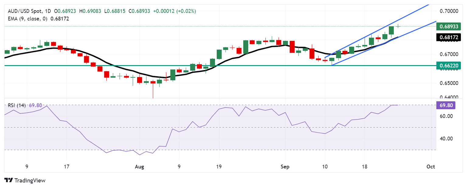 The AUD/USD pair trades near 0.6890 on Wednesday. Technical analysis of the daily chart indicates that the pair is moving upward within the ascending channel pattern, suggesting a bullish bias. Additionally, the 14-day Relative Strength Index (RSI) has advanced towards the 70 mark, suggesting upward gains remain probable but could face a consolidation soon.