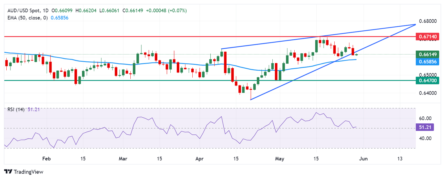 The Australian Dollar trades around 0.6610 on Thursday. An analysis of the daily chart suggests the weakening of a bullish bias for the AUD/USD pair, as it has broken below the lower boundary of a rising wedge. The 14-day Relative Strength Index (RSI) is positioned at the 50 level, and further decline may confirm the momentum shift.