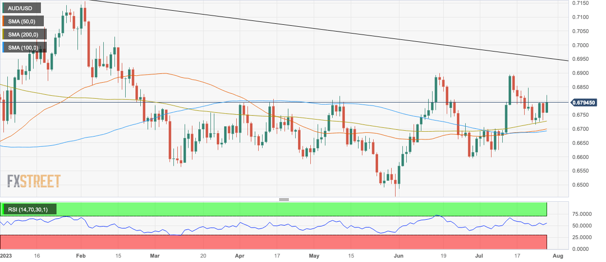 The Australian Dollar (AUD) plummets against the US Dollar (USD) on Friday, breaking through all major daily Simple Moving Averages (SMA) as it extends loses after the release on Thursday of better-than-expected US GDP data for the second quarter. An unexpected rise in the Federal Reserve's (Fed) preferred inflation gauge, Personal Consumption Expenditure (PCE), on a month-on-month basis, on Friday, keeps up the downside pressure on the pair.