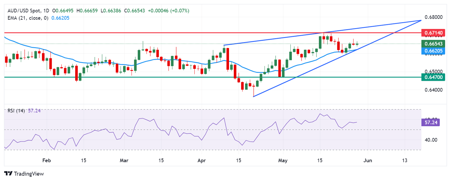 The Australian Dollar trades around 0.6650 on Wednesday. An analysis of the daily chart suggests a bullish bias for the AUD/USD pair, as it is positioned within a rising wedge. The 14-day Relative Strength Index (RSI) is slightly above the 50 level, further confirming this bullish bias.