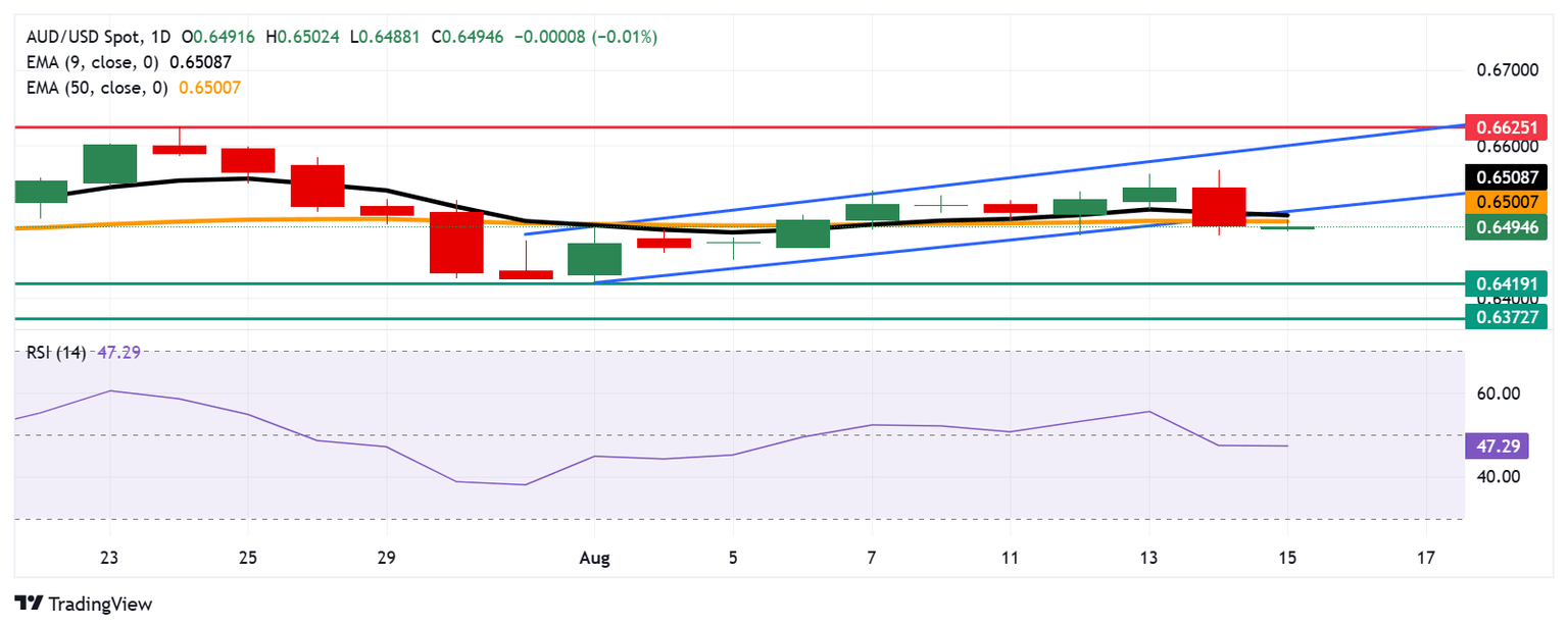 The AUD/USD pair is trading around 0.6490 on Friday. Technical analysis on the daily chart suggests a momentum shift from bullish to bearish bias as the pair has broken below the ascending channel pattern. The pair also moved below the nine-day Exponential Moving Average (EMA), signaling that short-term momentum is weaker. Moreover, the 14-day Relative Strength Index (RSI) is positioned below the 50 level, suggesting that market bias is bearish.