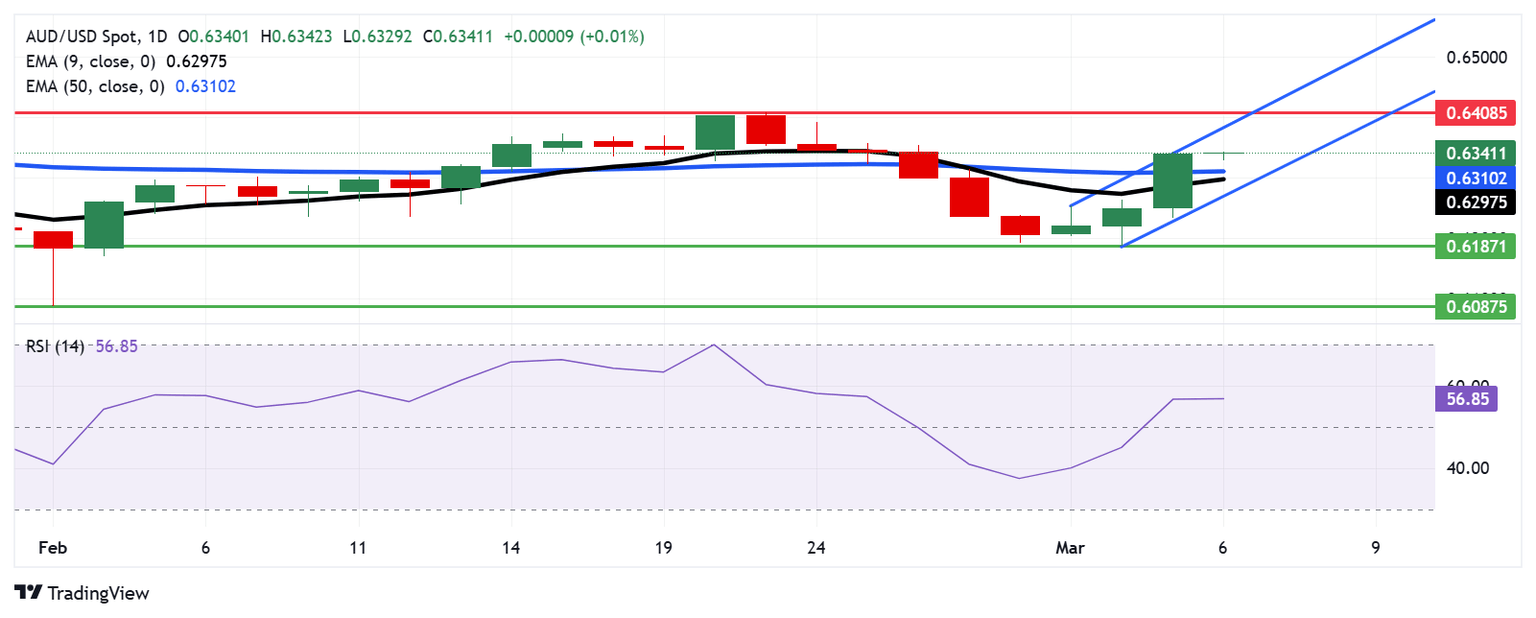 AUD/USD is trading near 0.6330 on Thursday, with technical analysis of the daily chart showing an upward movement within a newly formed ascending channel pattern, indicating a bullish bias. The 14-day Relative Strength Index (RSI) remains above 50, further supporting the bullish outlook.